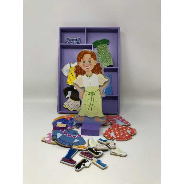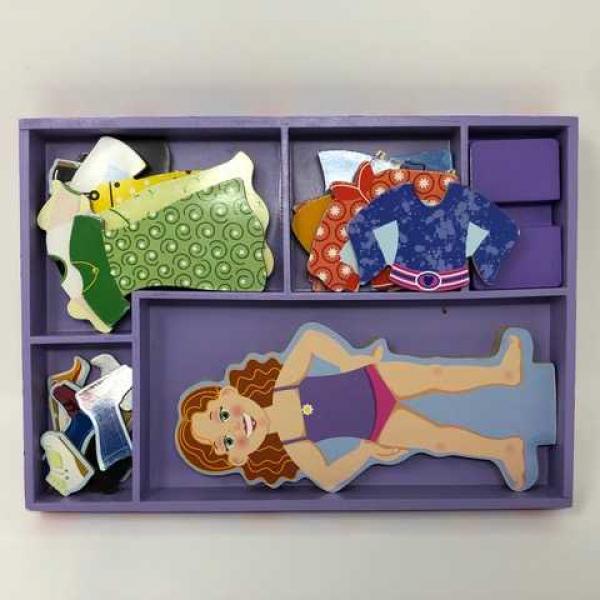 Contains: 1 wooden figure and stand, plus 27 magnetic pieces of clothing, accessories, and a sturdy wooden storage tray.