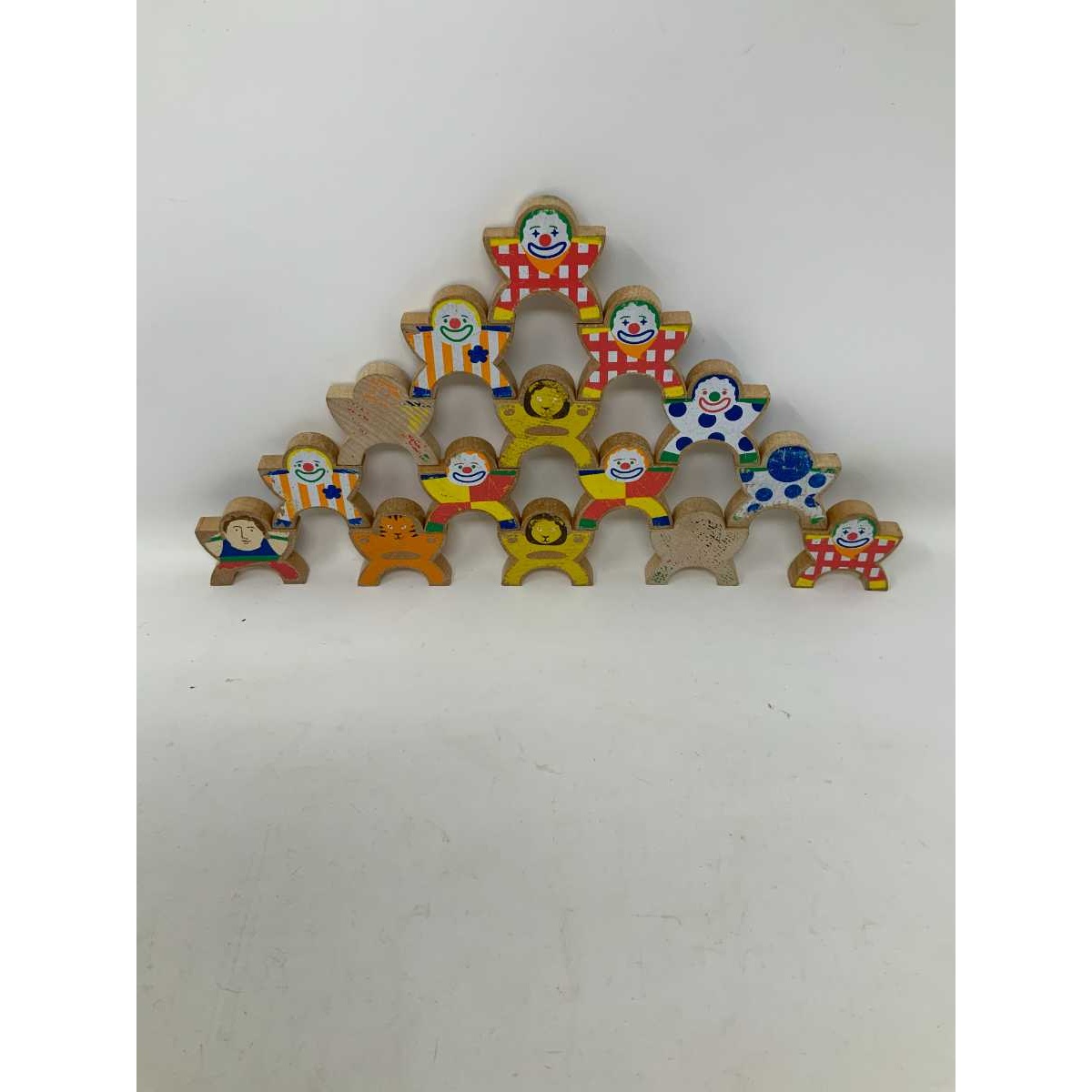 Stack the clowns and animals to build a human pyramid, or play circus. Figurines are made of wood and painted, Paint came off some of the figurines.
