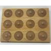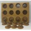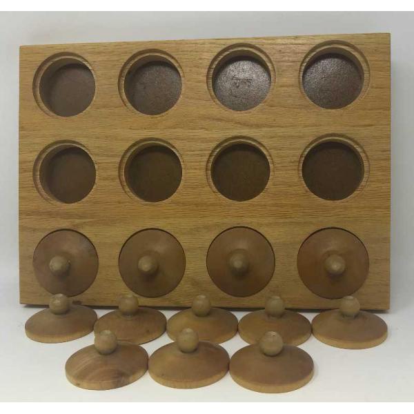 1 wooden board with 12 circular spaces, 12 wooden tops with knobs