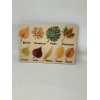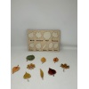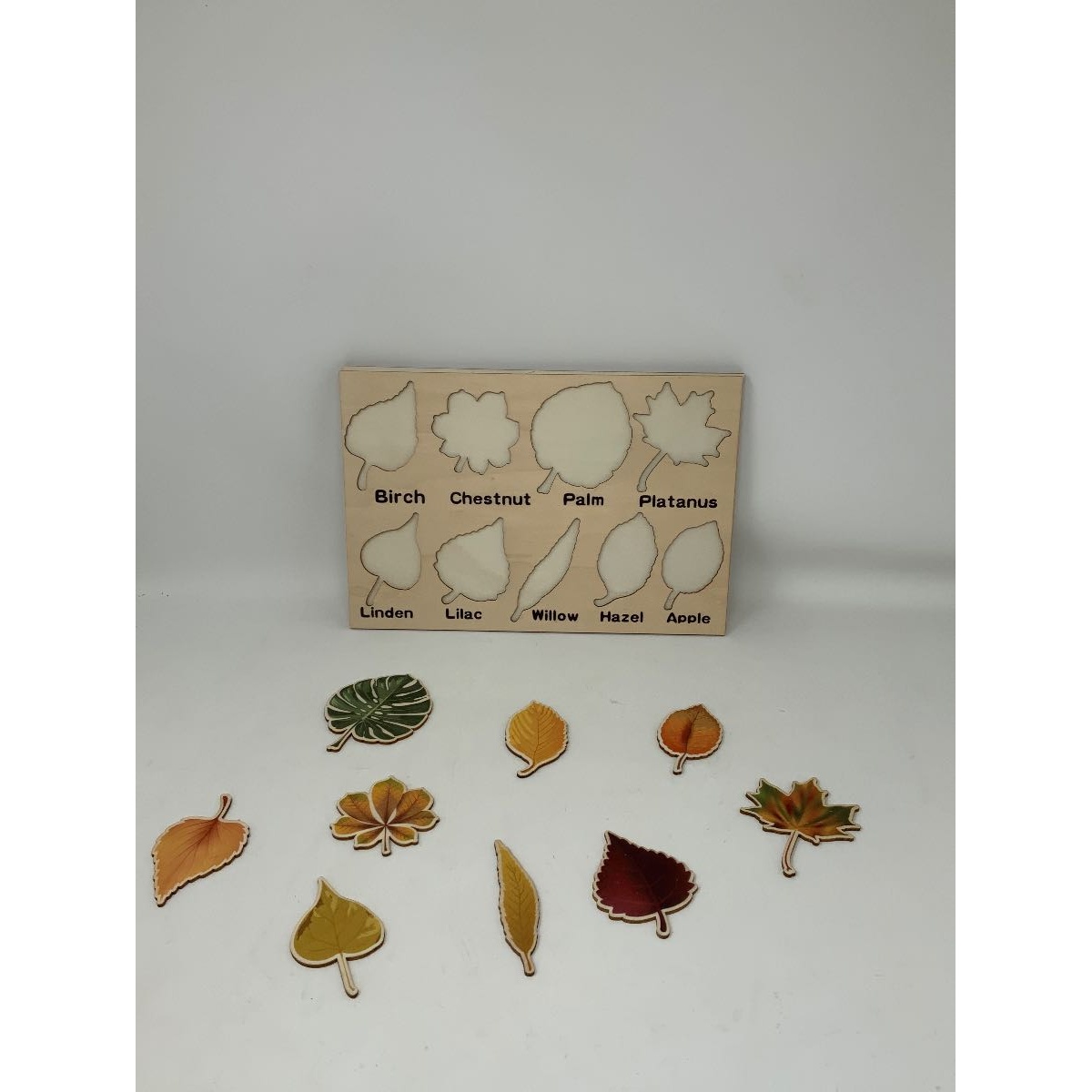 Wooden puzzle featuring nine different types of autumn leaves: birch, chestnut, palm, platanus, linden, lilac, willow, hazel and apple. Dimension:
